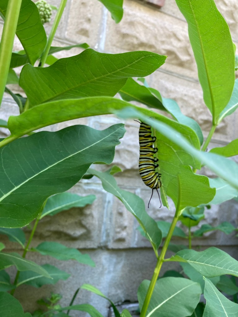 Monarch Butterflies. We’ve encouraged milkweed plants to grow in our yard for several years but haven’t seen any monarch caterpillars on them till this year. We enjoy watching the caterpillars munch on the leaves and seeing how much they move from plant to plant. A side benefit is having so many bees on the flowers – they seem to love the plants as much as the butterflies do. We’re also hoping eventually to see the caterpillar-to-butterfly chrysalis process!